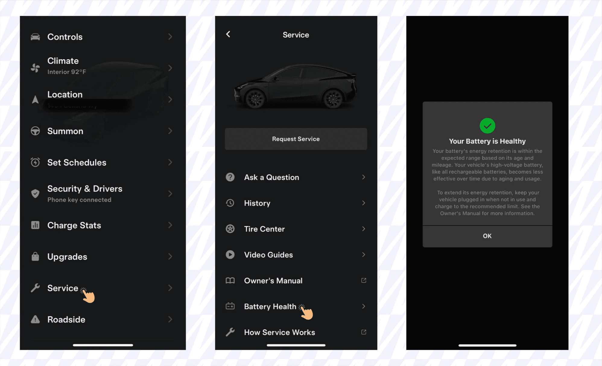 Every Tesla owner can view a Battery Health Check inside the Tesla mobile app, which provides a software-based overview of battery status based on age, mileage, and retention.