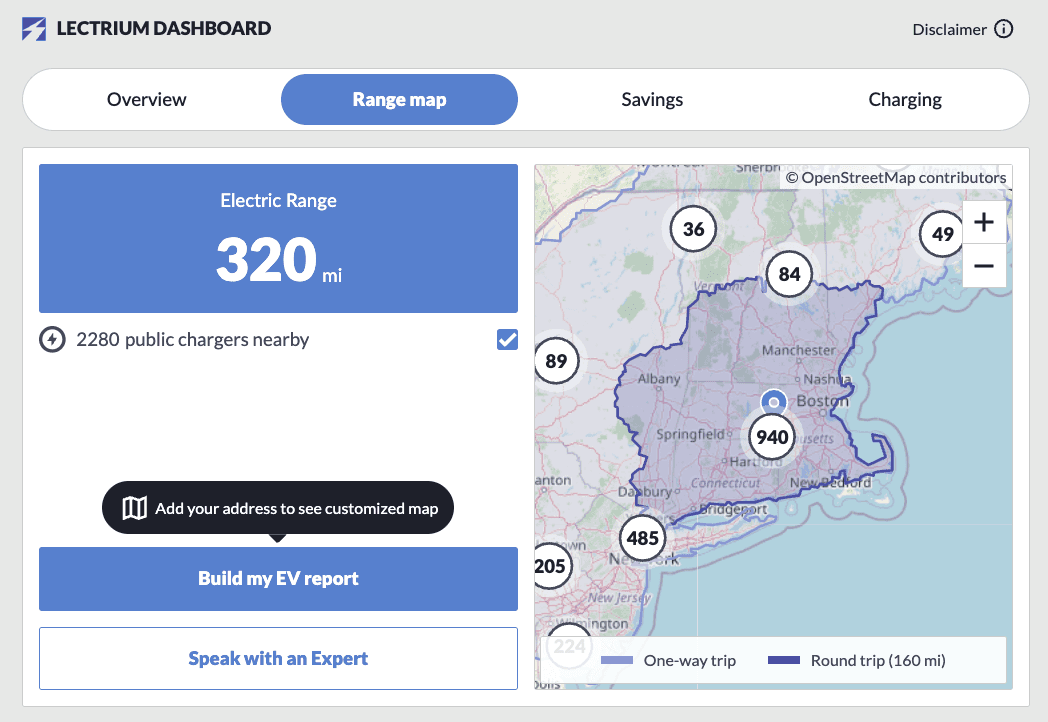 The Range Map takes driving data and turns it into an intuitive map visualization that shows exactly how far a driver can go on a single charge or tank, using real driving roads (not just a circular radius)!