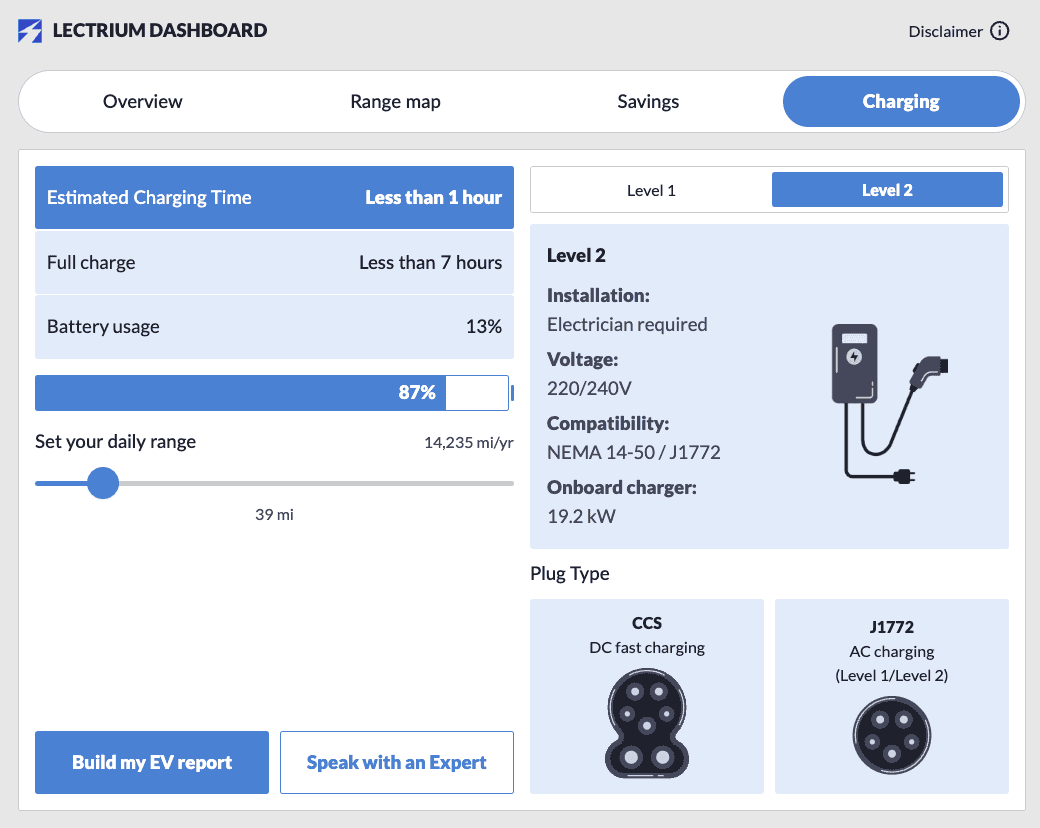 It helps shoppers understand what charging looks like in practice, whether that means plugging into a standard outlet overnight or installing a faster charging station at home. Instead of vague language or technical jargon, the Dashboard presents clean visuals and real numbers that anyone can follow.